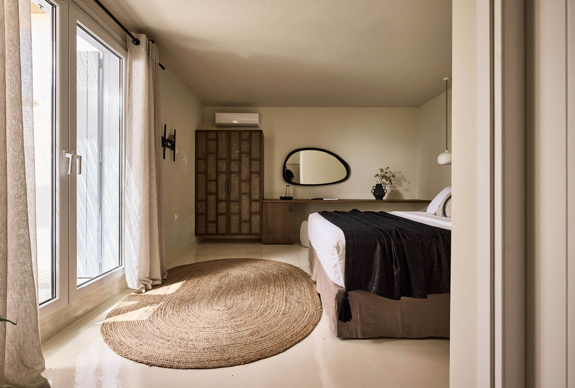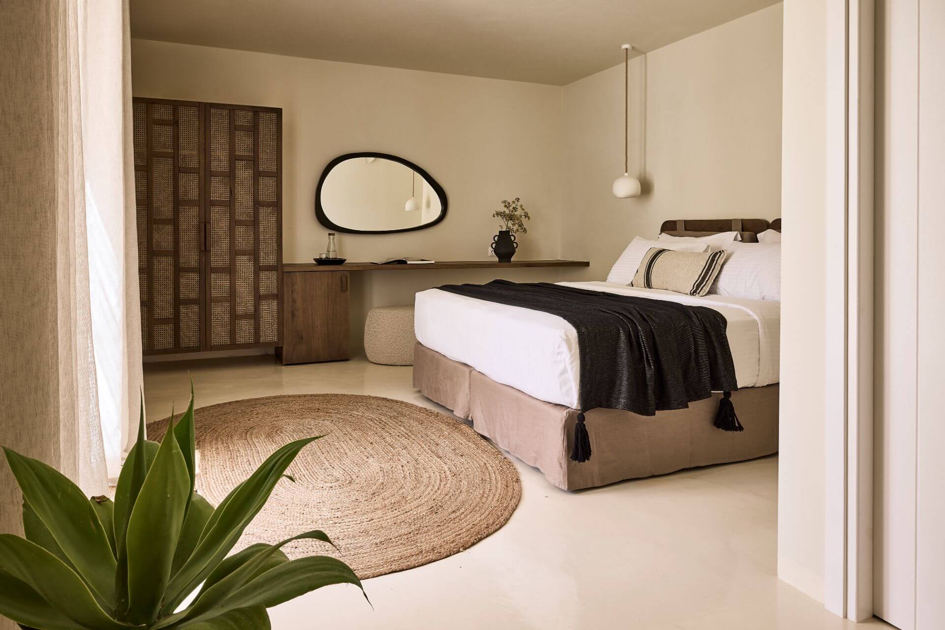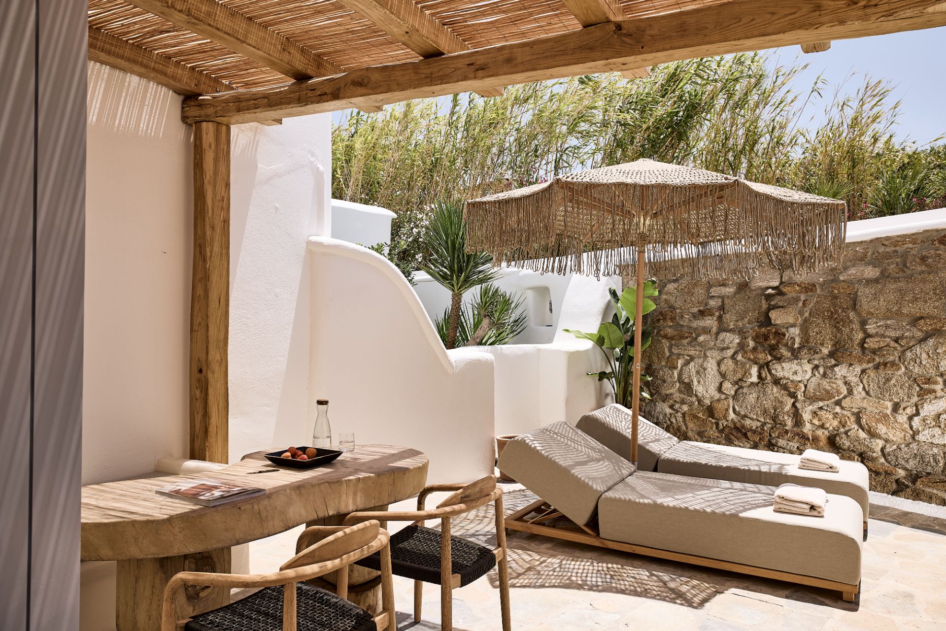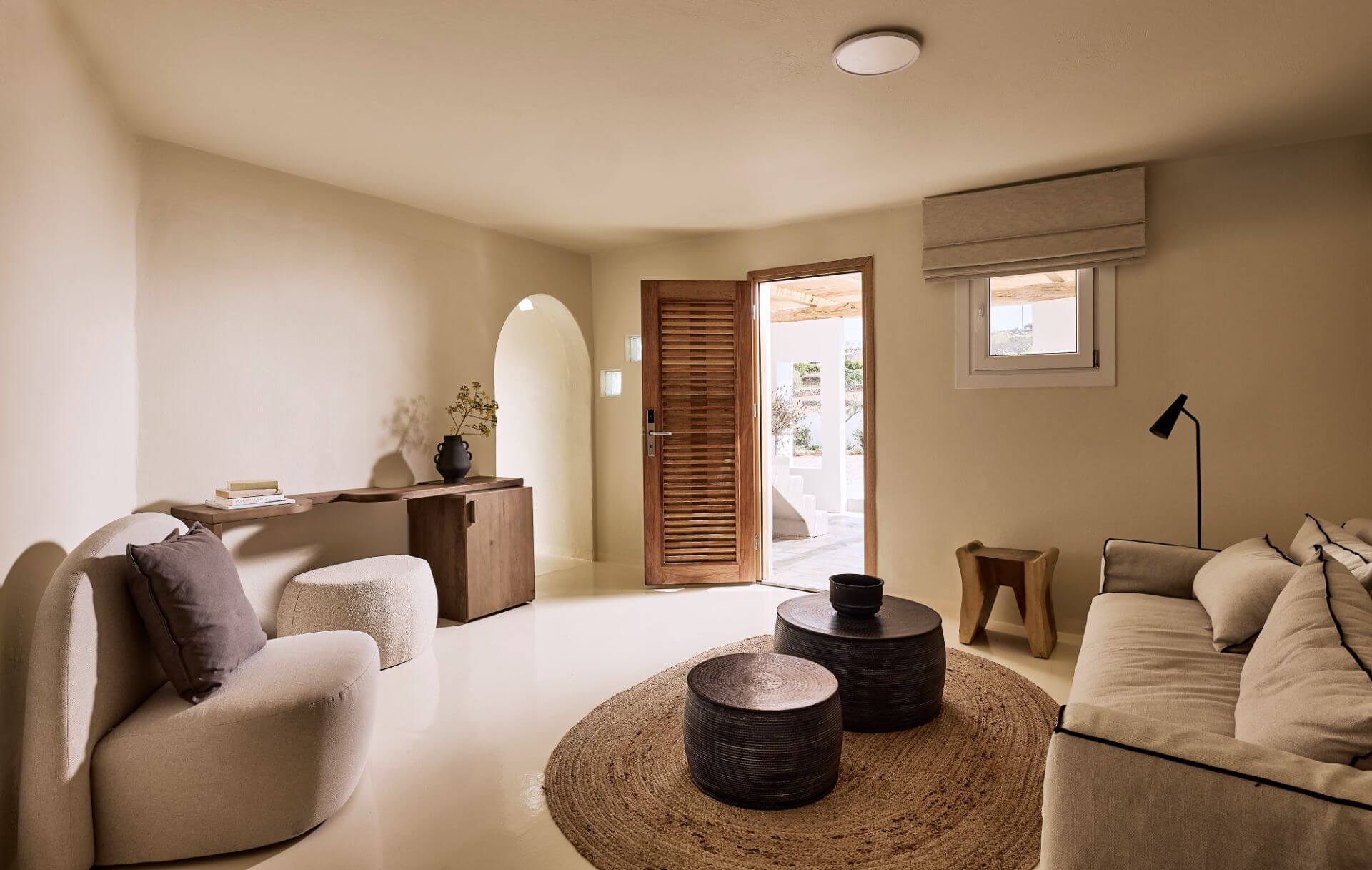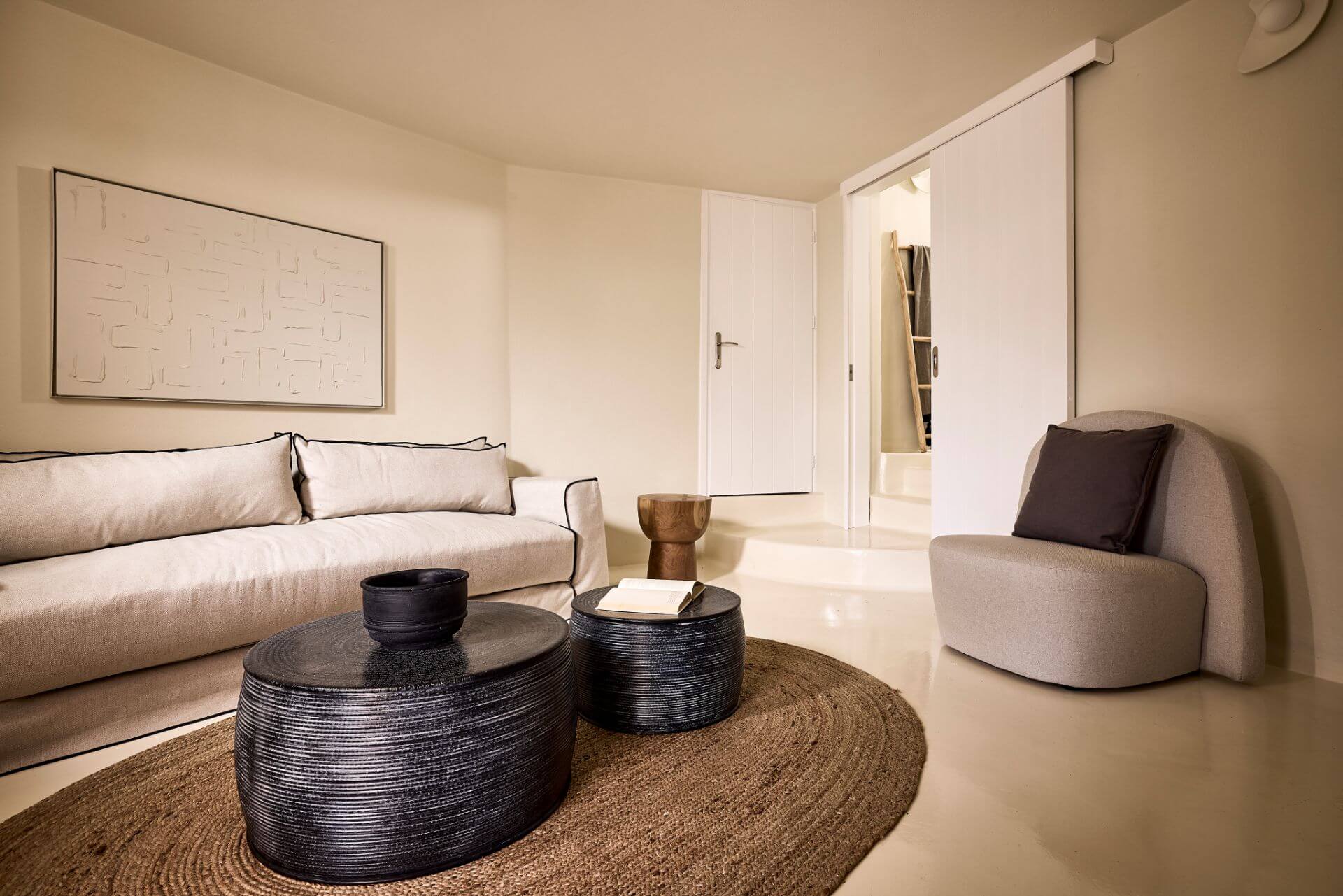 Accommodating up to 7 adults, Villa Accalia is a 3 bedroom, Garden view, Mykonian retreat whose luxurious furnishings and natural colour palette compose a sense of calm. A secluded haven of bohemian luxury, Villa Accalia features a central cosy living area, which connects to an exterior sun soaked private courtyard area, where guests can indulge in a space of uninterrupted peace.