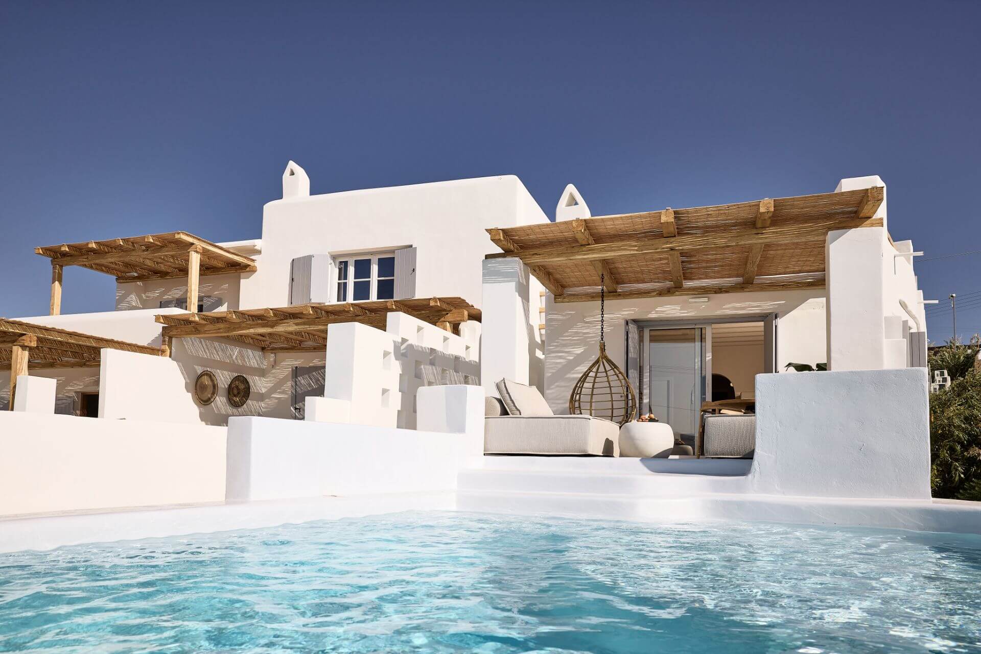 Villa Kalista introduces guests to an authentic and luxurious Mykonian haven of tranquility. Accommodating up to 5 adults, the villa’s natural elements, luxurious furnishings and natural colour palette compose a sense of calm. Villa Kalista’s two en-suite bedrooms connect to a spacious sea view open plan living and dining area, which further open up to a private pool and sunset terrace, perfect for moments of togetherness.